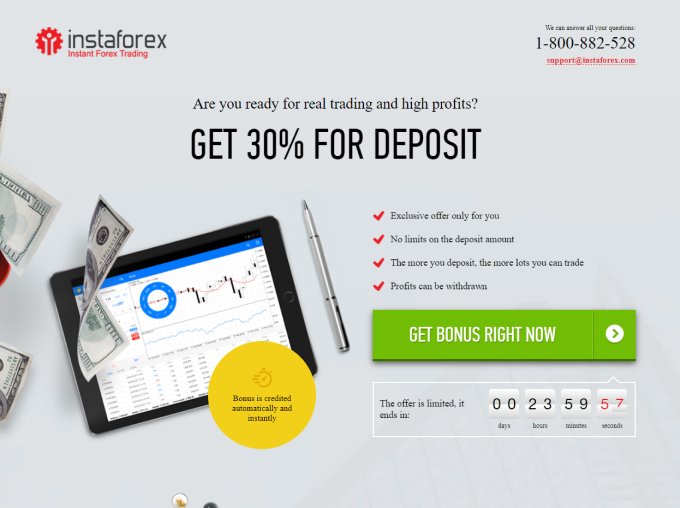 শুধুমাত্র ইন্সটাফরেক্সের গ্রাহকদের জন্য লোভনীয় অফার। আপনার ট্রেডিং অ্যাকাউন্টে তহবিল জমা করুন এবং অতিরিক্ত +30% ডিপোজিট বুঝে নিন। যত বেশি ডিপোজিট তত বেশি পরিমাণে ট্রেড করার সুযোগ। কোন নির্দিষ্ট সীমা ছাড়াই যেকোন ডিপোজিটের জন্য তাৎক্ষণিকভাবে বোনাস প্রদান করা হয়।