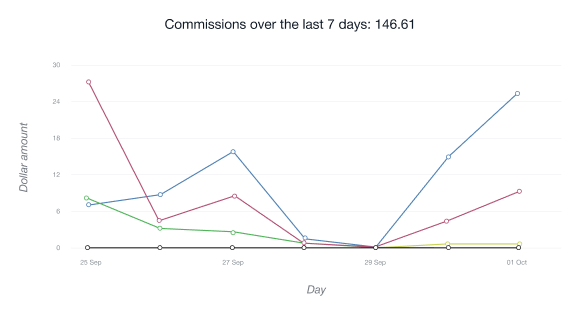 • Puede ver el total de comisiones que ha obtenido de sus referidos dentro de un cierto periodo de tiempo, o puede elegir un cierto codigo de afiliado y ver el total de comisiones de los referidos que se registraron a traves de este codigo en particular.